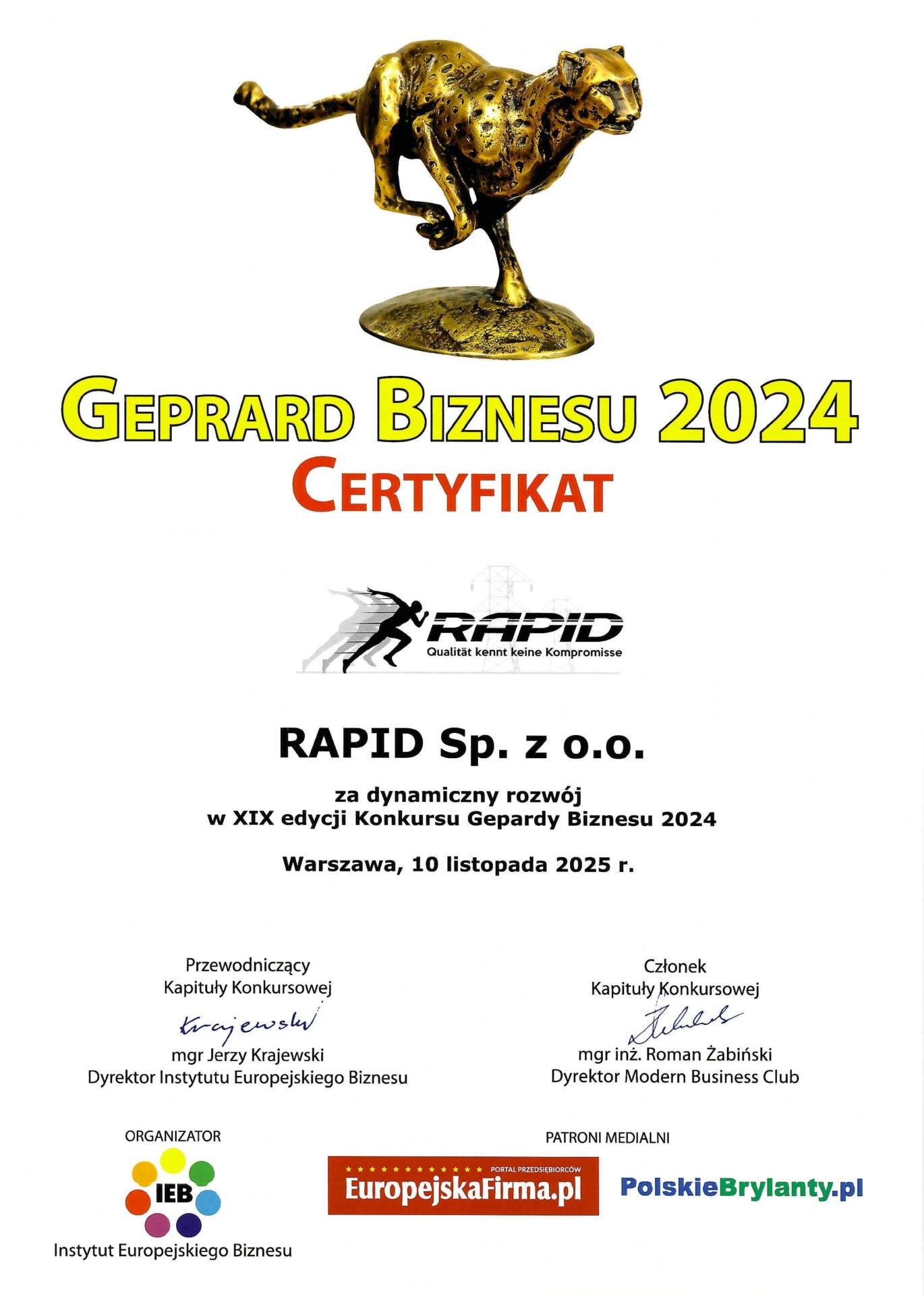 Certyfikat Gepard Biznesu 2023 za dynamiczny rozwój w XVIII edycji Konkursu Gepardy Biznesu 2023